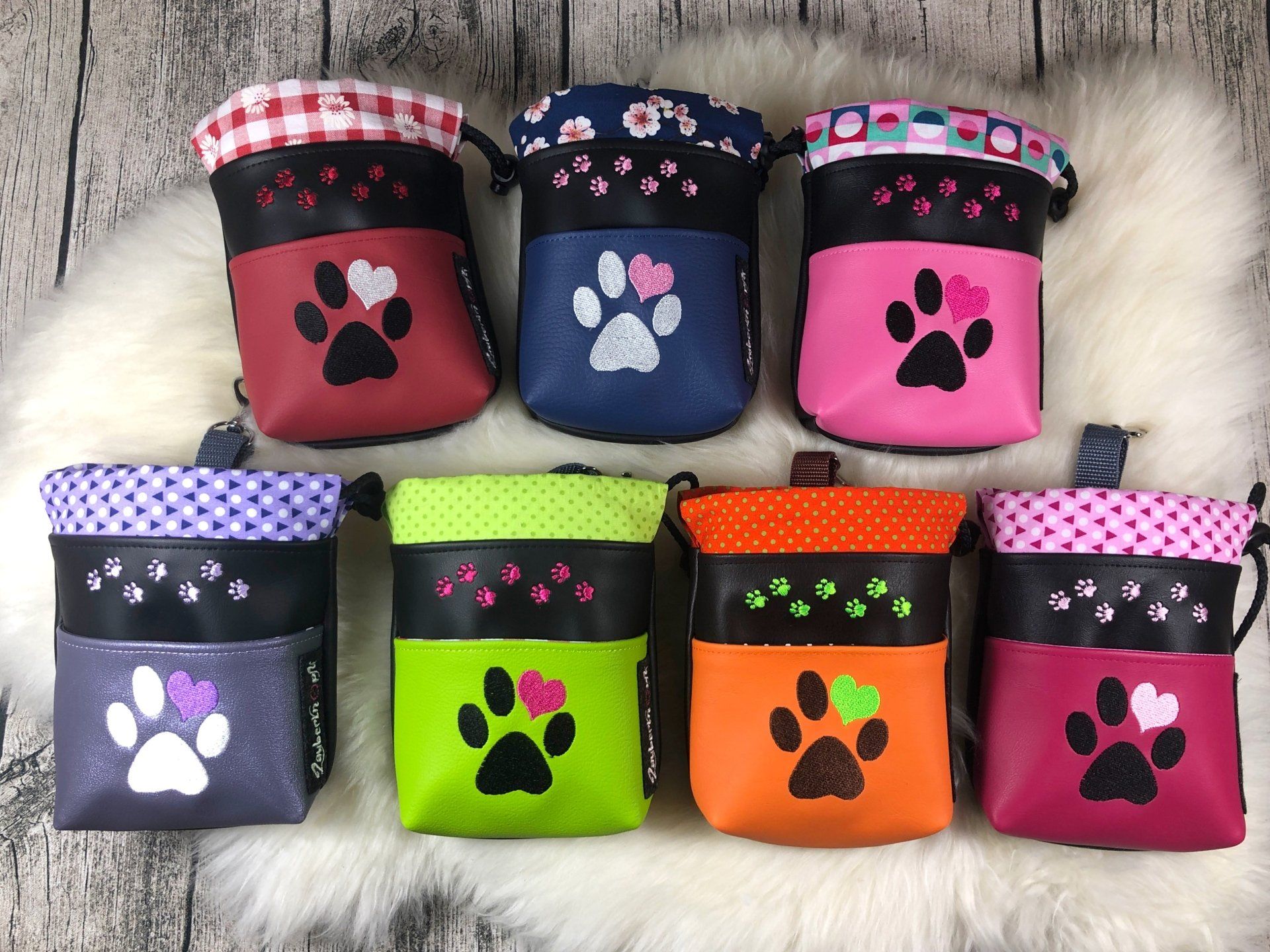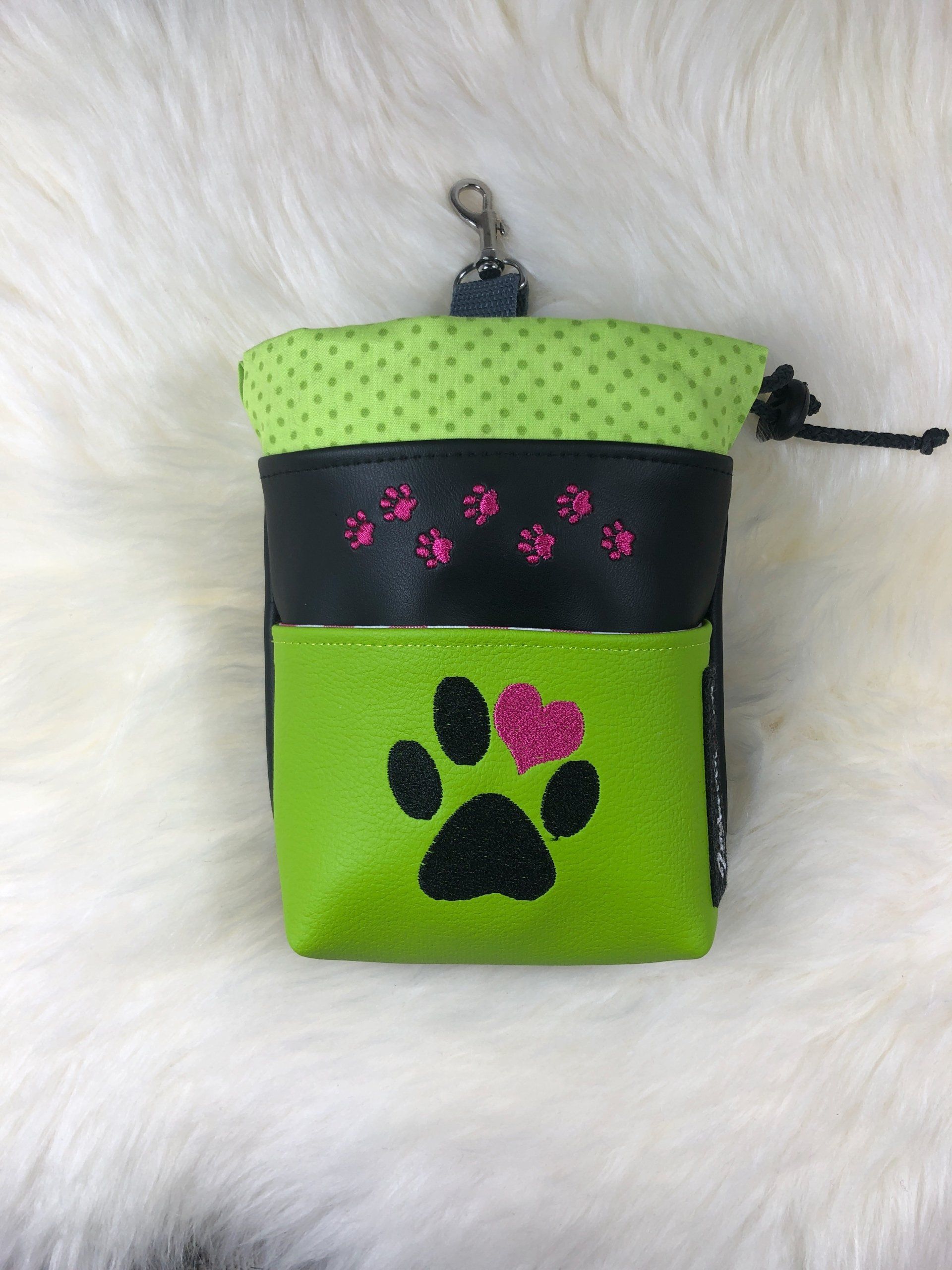 The bags have a belt loop and a carabiner, so you can wear them in different ways. Behind the large paw there is a pocket for poop bags etc. The treat bags are washable inside and out.