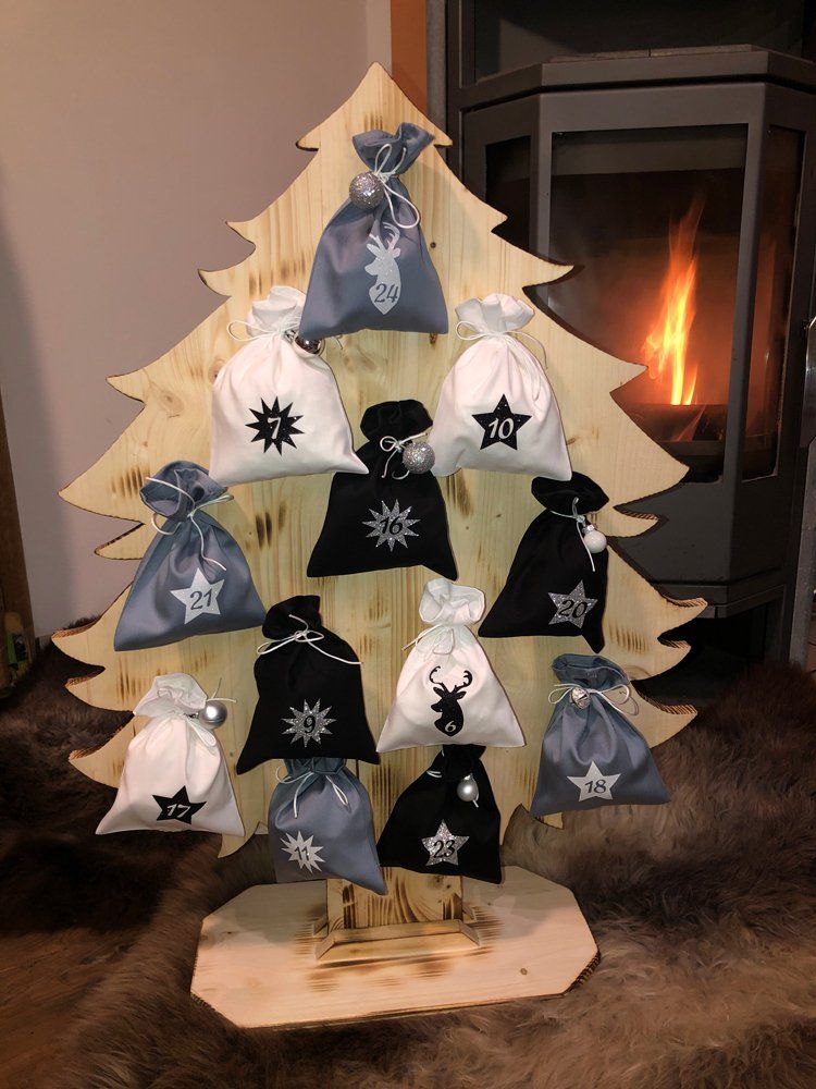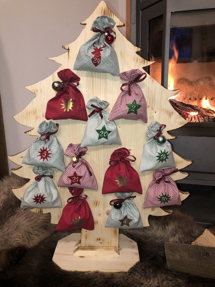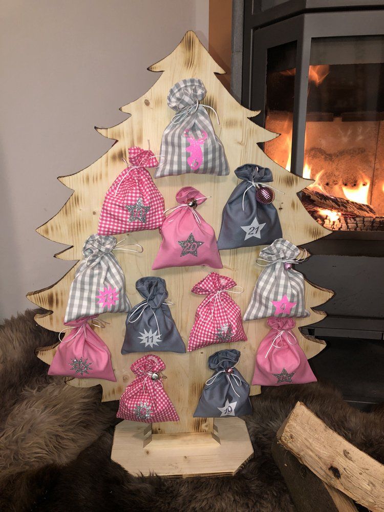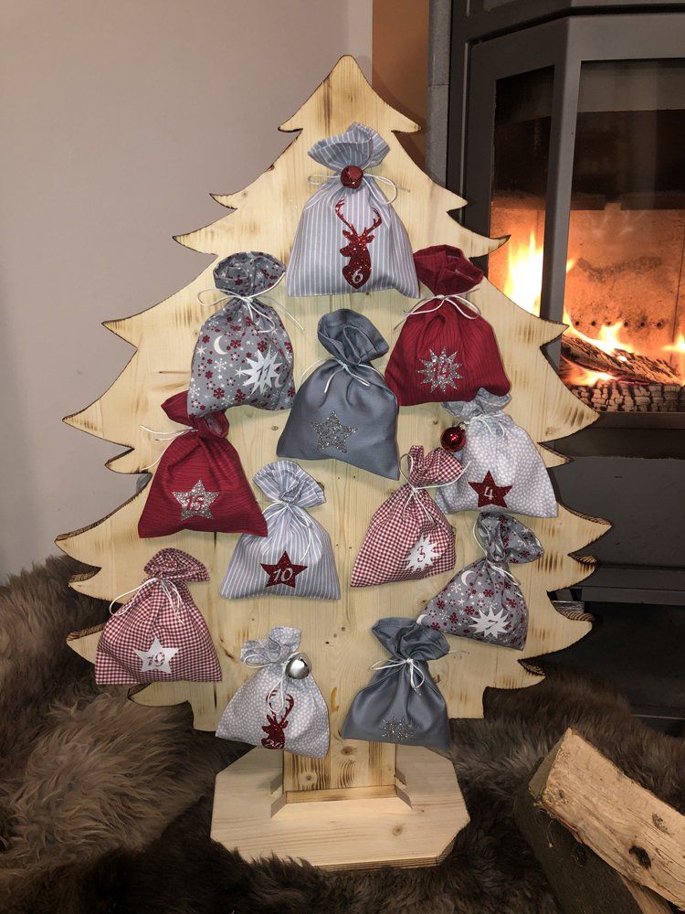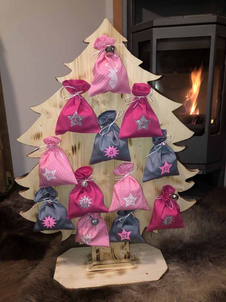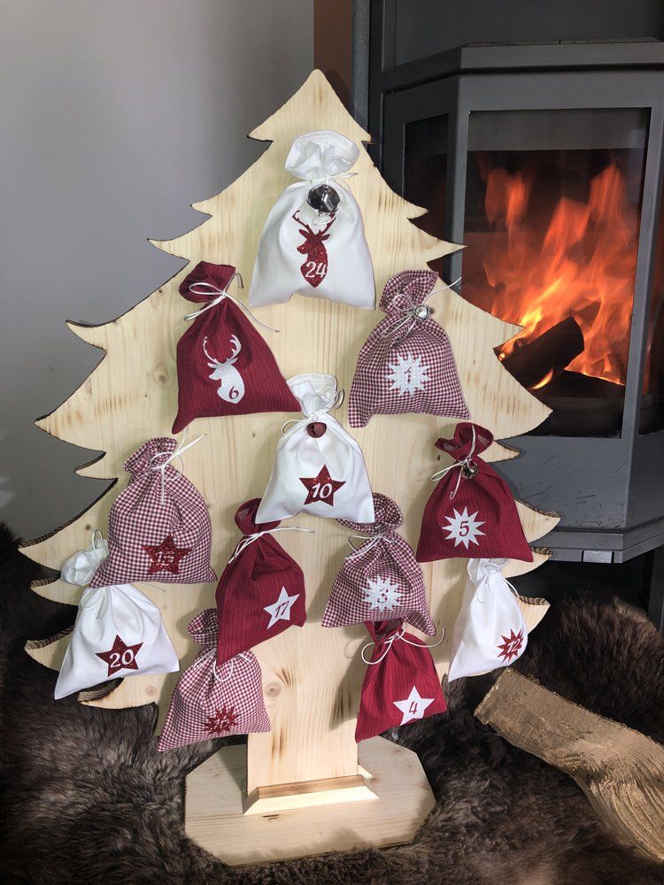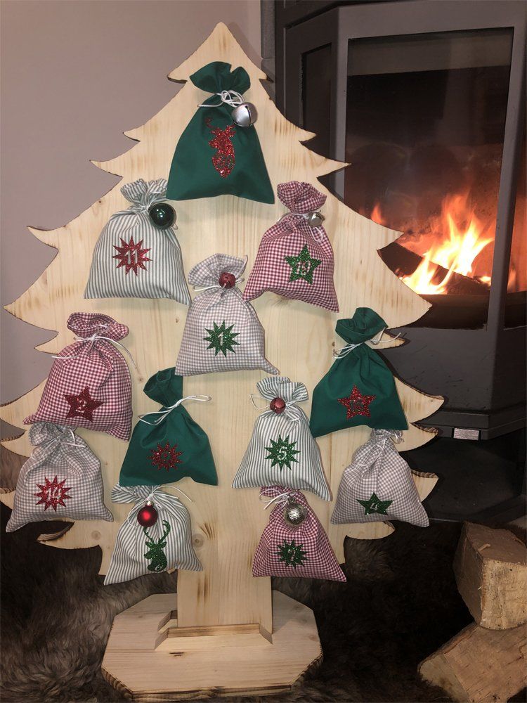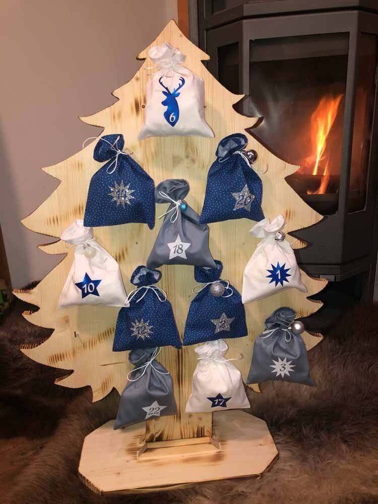 Hier seht ihr unsere Adventskalender aus Holz mit verschiedene Adventssäckchen.