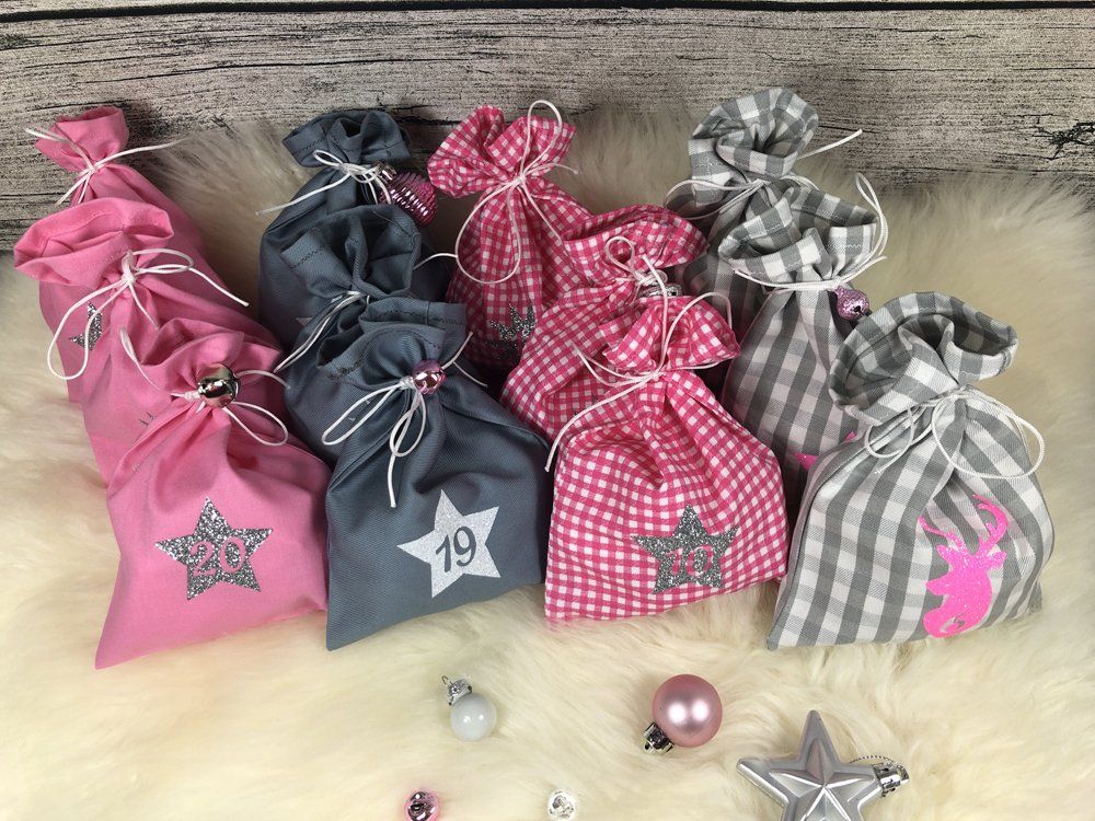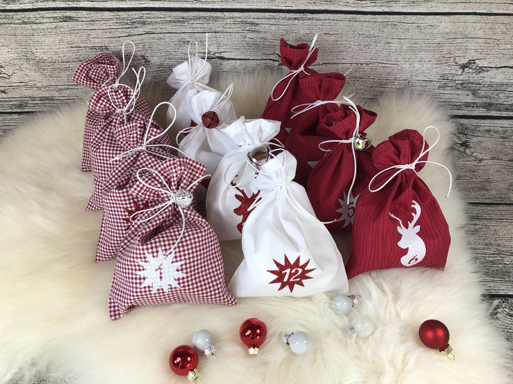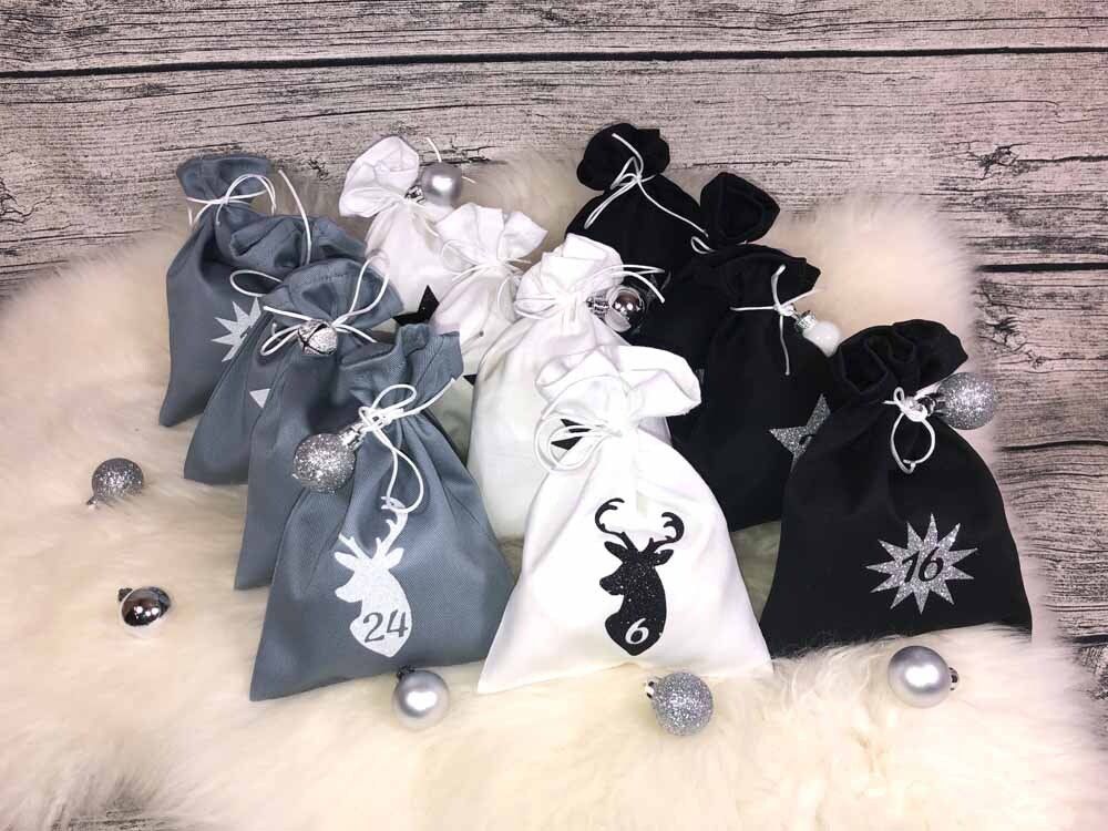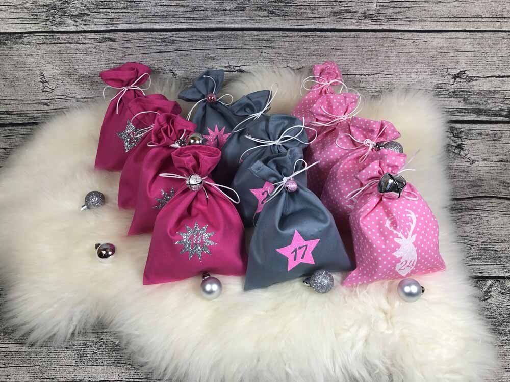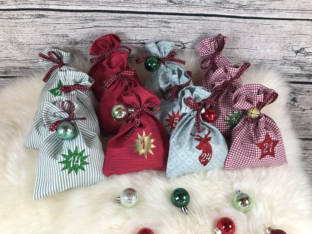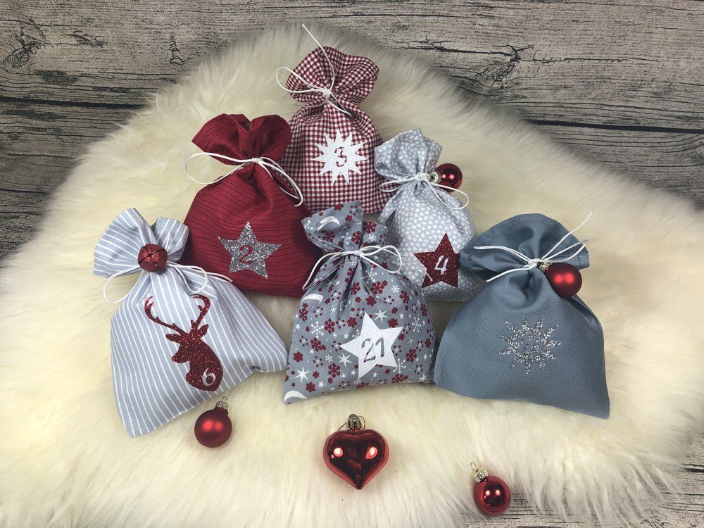 Die Kalendersäckchen haben eine Größe von ca: 13x17cm und können ebenfalls ganz individuell gestaltet werden. Zu den Säckchen gibt es ein paar Kugeln und Glöckchen dazu und natürlich Schnürre zum Binden.